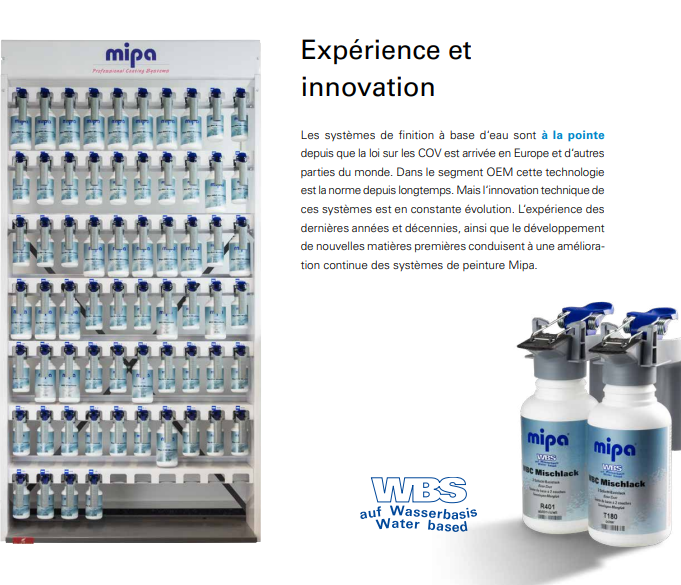 Les systèmes de finition à base d‘eau sont à la pointe depuis que la loi sur les COV est arrivée en Europe et d‘autres parties du monde. Dans le segment OEM cette technologie est la norme depuis longtemps. Mais l‘innovation technique de ces systèmes est en constante évolution. L‘expérience des dernières années et décennies, ainsi que le développement de nouvelles matières premières conduisent à une amélioration continue des systèmes de peinture Mipa.